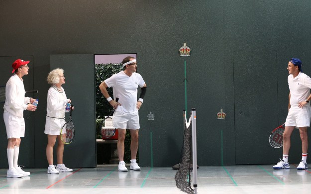 The plot, such as it is, partly focuses on the Bush dynasty, and the opening scene shows George H. W. Bush, Barbara Bush, George W. Bush, and Jeb Bush playing a game of tennis. In this sense, the title of the play refers to the tennis court, but there is an entirely separate story explored in the actual court life of royalty. Sarah Ruhl is drawing parallels between the Bushes and royalty in 17th Century England and, though it doesn’t always work, the playwright certainly has a good time making observations about both time periods. In addition, most of the actors play more than one character and they all seem to be having a great deal of fun onstage.