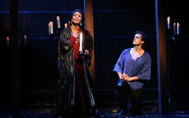 Before getting to the central problems in this production, it is worth hailing the good things about the show. Crucially, the three lead roles have been exceedingly well-cast. Robert Sean Leonard turns out to be a magnificent King Arthur, possessing all the grandeur required for the role, As his wife, Guenevere, the rich-voiced Britney Coleman is something of a cross between Vanessa Williams and Audra McDonald, but she manages to shine distinctly as her own unique actress. And perhaps the best news is that Westport Country Playhouse has found an ideal Lancelot in Stephen Mark Lukas, who sings like an angel, looks wonderful in Wade Laboissonniere’s costumes (actually all the costumes in the show are remarkable) and he can break your heart with his sensitive acting.