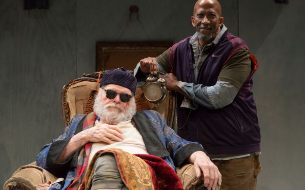 Still, whatever the flaws are about this production, the actors are good and do what they can to enliven the show. Sporting a full beard, Brian Dennehy certainly makes an unusual entrance. At the very start of the show, he is wheeled onstage sitting in a chair, with a dirty white blanket draped completely over him. It is only when another character, Clov (the excellent Reg E. Cathey), pulls the blanket off of him does the audience realize that Dennehy is indeed onstage. Playing the central role of Hamm, who is blind, Dennehy commandingly delivers long speeches during “Endgame” and, as always, he is a fascinating actor to watch, but even his talents cannot turn this show into anything truly interesting.