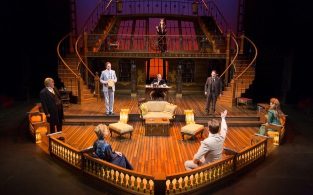 Hartford Stage is currently presenting a generally good revival of George Bernard Shaw’s “Heartbreak House.”  On a majestic, boat-inspired set, wonderfully designed by Colin McGurk, representing the family house, this production is very well paced, with a fine cast and mostly expert direction by Darko Tresnjak.  If there is one problem with the show, it is that one of the characters has been costumed to resemble Donald Trump, complete with blonde wig.  While the initial entrance of this character inspires laughter and applause, this directorial choice ultimately works against the play and the production.  Still, this is a minor problem, and the nine member cast is otherwise able to pull off George Bernard Shaw’s “Heartbreak House” with a great deal of finesse and wit.