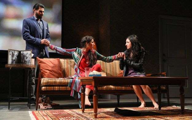 The attractive set of this show, nicely designed by Ao Li, is, basically, a living room, with a front door and a door that leads to the other rooms. The four actors that occupy the beginning of “Kiss” are all good and turn in effective performances. The show starts with Hadeel (Sohina Sidhu) welcoming James Cusati-Moyer, as Youssif, into her home for what seems to be a viewing party of the soap opera they are involved in. Two other characters factor into the plot, Ian Lassiter as Amid and Hend Ayoub as Bana. There are various interrelations between the four characters and numerous romantic couplings, to the point that the show almost gets confusing.
