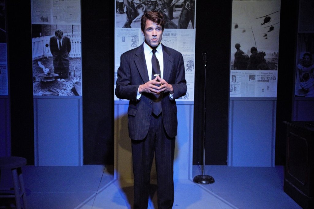 Of course, without a strong actor at the helm, “RFK” would not be particularly effective, and Music Theater of Connecticut is very fortunate to have Chris Manuel as Bobby Kennedy. I have seen this actor to fine effect in previous productions at this theater, in shows such as “Ragtime” and “Jekyll and Hyde.” Still, it must be stated that Manuel’s previous work couldn’t begin to hint at how wonderful he is taking on a show all his own. Indeed, Manuel’s performance keeps the audience riveted. This actor’s presence onstage is powerful, and he can make various stories about Bobby Kennedy, from his jumping in a lake for a swim, to his winning the California primary as the Democratic presidential candidate just as significant and fascinating. Manuel has Kennedy’s manner and voice completely right, but it is truly an inner spark which makes this actor so good and he seems to carry this show effortlessly.