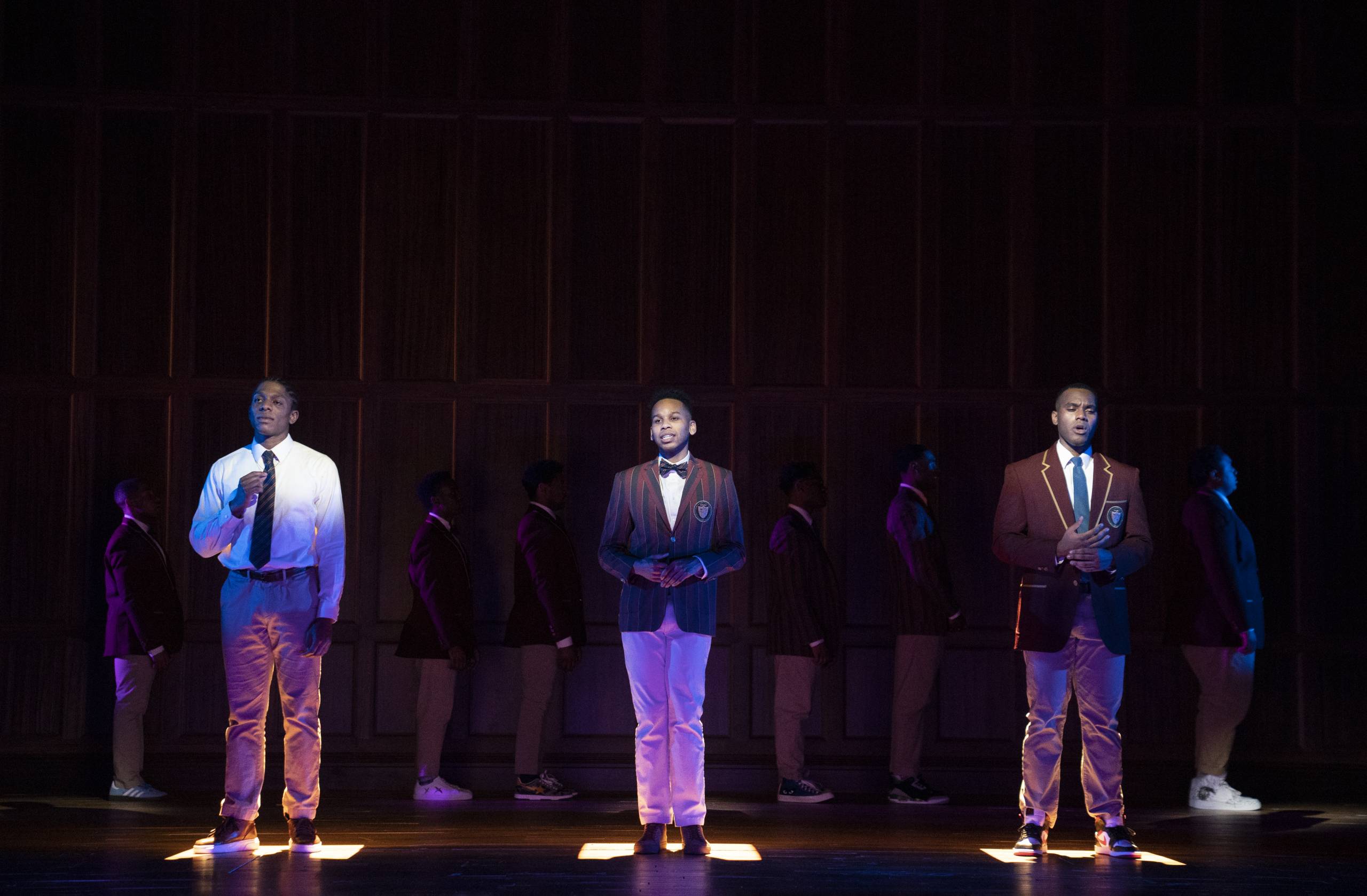Tarell Alvin McCraney’s excellent play, “Choir Boy,” is being given a strong production at Yale Repertory Theatre.  Focusing on the character of Pharus (terrifically played by Israel Erron Ford), a gifted student at the Charles R. Drew Prep School for Boys, “Choir Boy” shows how Pharus tries to take his place as the leader of the school choir and the various obstacles in his way.  Director Christopher D. Betts stages the show smoothly through its two hour running time, with a wonderful cast and design team.  This play also explores the subject of homosexuality, as well as homophobia, as it reveals Pharus’ coming of age story.  In between the dramatic scenes, there is a great deal of beautiful a cappella singing, which fills the theater with joy.  “Choir Boy” is a deeply felt and worthwhile show at Yale Repertory Theatre, and it is most highly recommended.