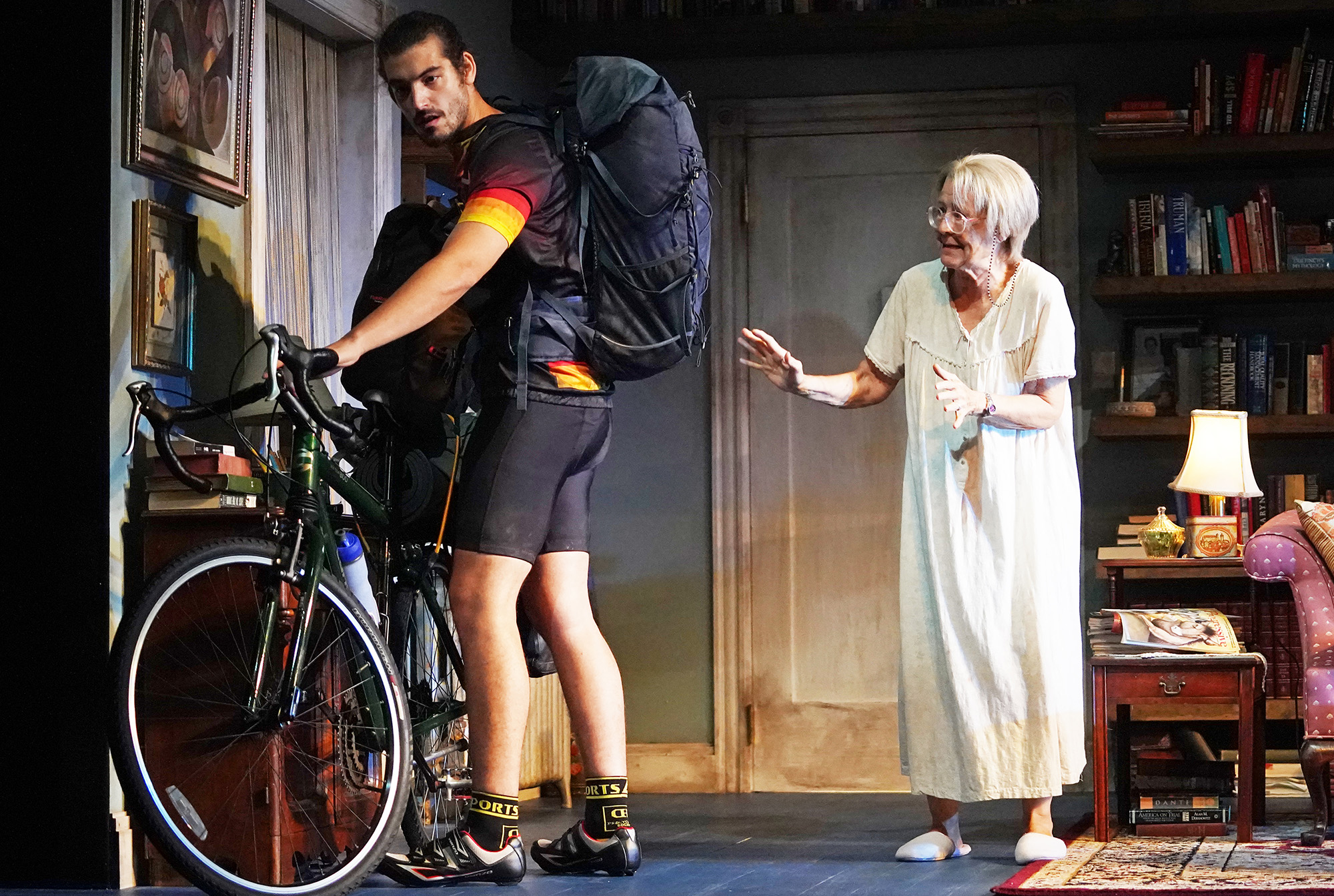 On Arnulfo Maldonado’s beautiful set of a Manhattan apartment, “4000 Miles” shows how Leo and his grandmother Vera gradually get to know each other when Leo decides to stay with her for an undisclosed period of time. In addition to these two characters, there is also Bec, Leo’s on-again/off-again girlfriend, and Amanda, whom Leo, at one point, brings back to the apartment for a one-night-stand. Clay Singer is extremely good as Leo and he is quite believable as a young man who lives his life without knowing what will come next and who thinks nothing of having traveled across the country on his bike. As Bec, Lea DiMarchi does a satisfying job in her two scenes in the play and she fully displays the discord and disappointment she has with Leo, though she also brings an endearing quality to her character.
