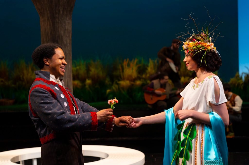 As King Polixenes, Omar Robinson is just perfect and Daniel Davila, Jr. shines as his son, Florizel. Delfin Gokhan Meehan is ideal as Perdita, Florizel’s betrothed, who is probably the most pivotal character in the play. John Maddaloni is extremely good as the Shepherd’s son and Pearl Rhein is terrific in the showy role of the playful Autolycus. Also adding much to the production are the beautiful costumes, provided by Whitney Locher, and the lighting design by Evan Anderson is one of the finest elements in the show, by turns haunting, festive, and, by the conclusion, almost otherworldly.
