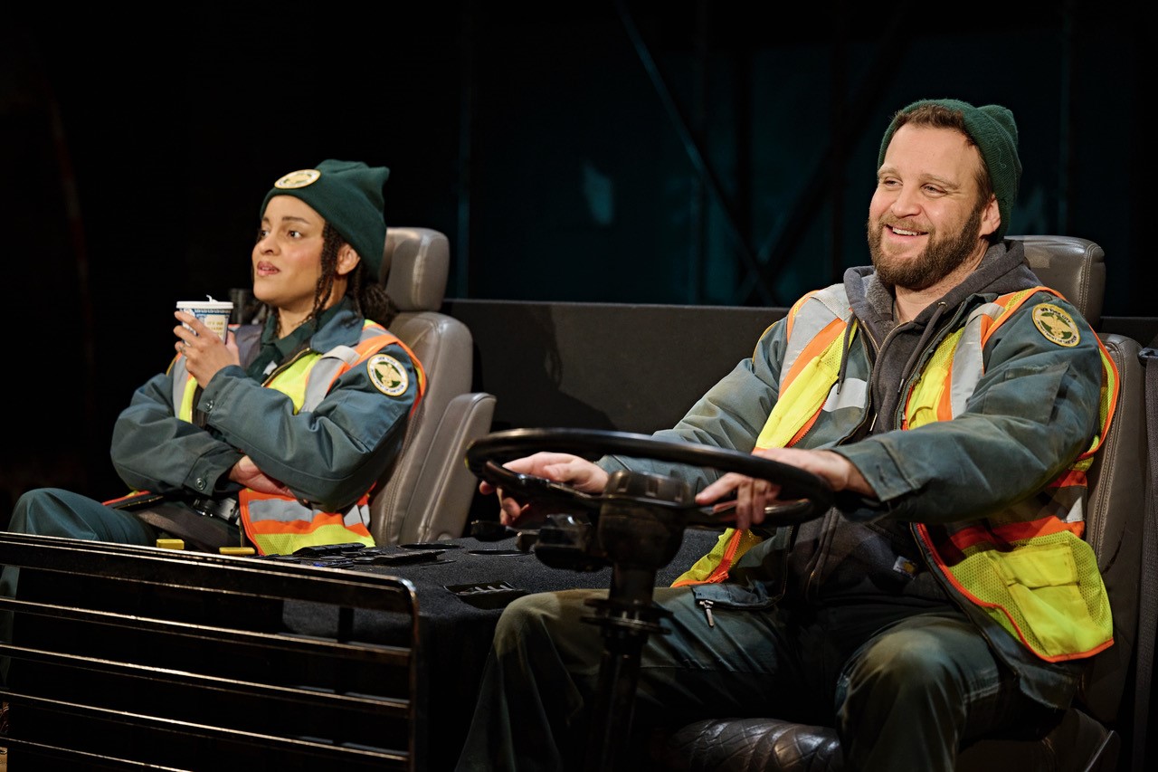 The playwright fills this show with a great deal of engaging dialogue and she has fashioned back stories for both Danny and Marlowe that can be funny and tough, as well as being surprisingly moving.  Both Brooks and Simpson excel at digging into each of their characters and revealing them as being multi-dimensional.  In addition to working terrifically with the actors, director Rob Ruggiero does a great job with his designers, as well.  As mentioned, the scenic design of the truck is remarkably real onstage, but Marcelo Martinez Garcia also does well at having different set pieces moved in, which can transform the stage into a bar or even a park for a bench scene late in the show.  The costumes by Joseph Shrope are uncannily appropriate, with the added benefit that even the stage hands (who appear during the scene changes) are similarly clad in uniforms befitting garbage workers.  John Lasiter’s striking light design is enormously effective and the sound design, by German Martinez, is crystal clear.