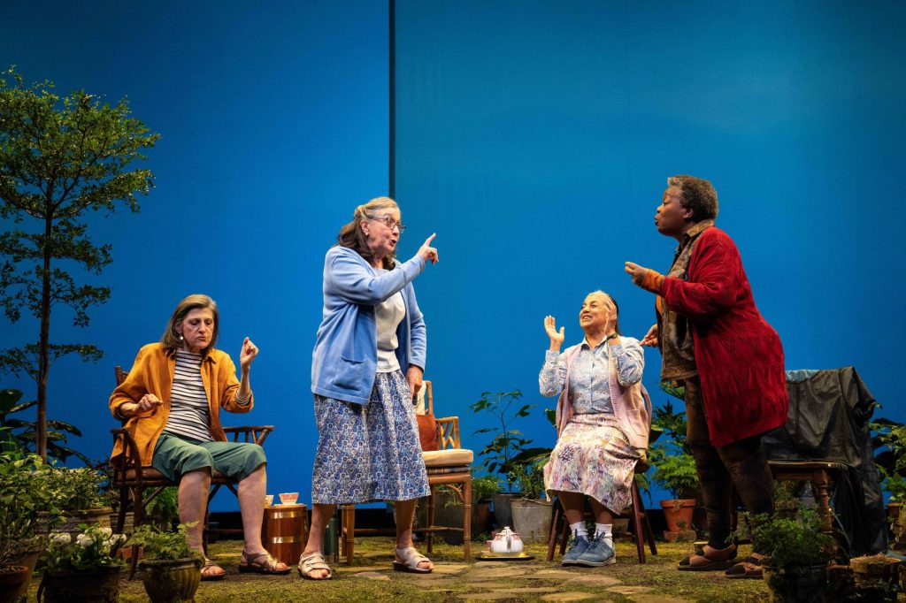 On Lia Tubiana’s sunny and appealing set, “Escaped Alone” presents four women seated in lawn chairs in a garden.  The chatter between the four of them is pleasant and there are definitely some laughs in the show.  It also helps that the actresses playing these parts are skilled and can make the most out of every moment.  As Vi, Mary Lou Rosato is quite good and her big moment is her talking about her anxiety about going in her kitchen due to something gruesome which happened there years ago.  Sandra Shipley, as Sally, gets a great deal of laughter when she talks about her obsessive phobia of cats (at the performance I attended, she got applause after her monologue).